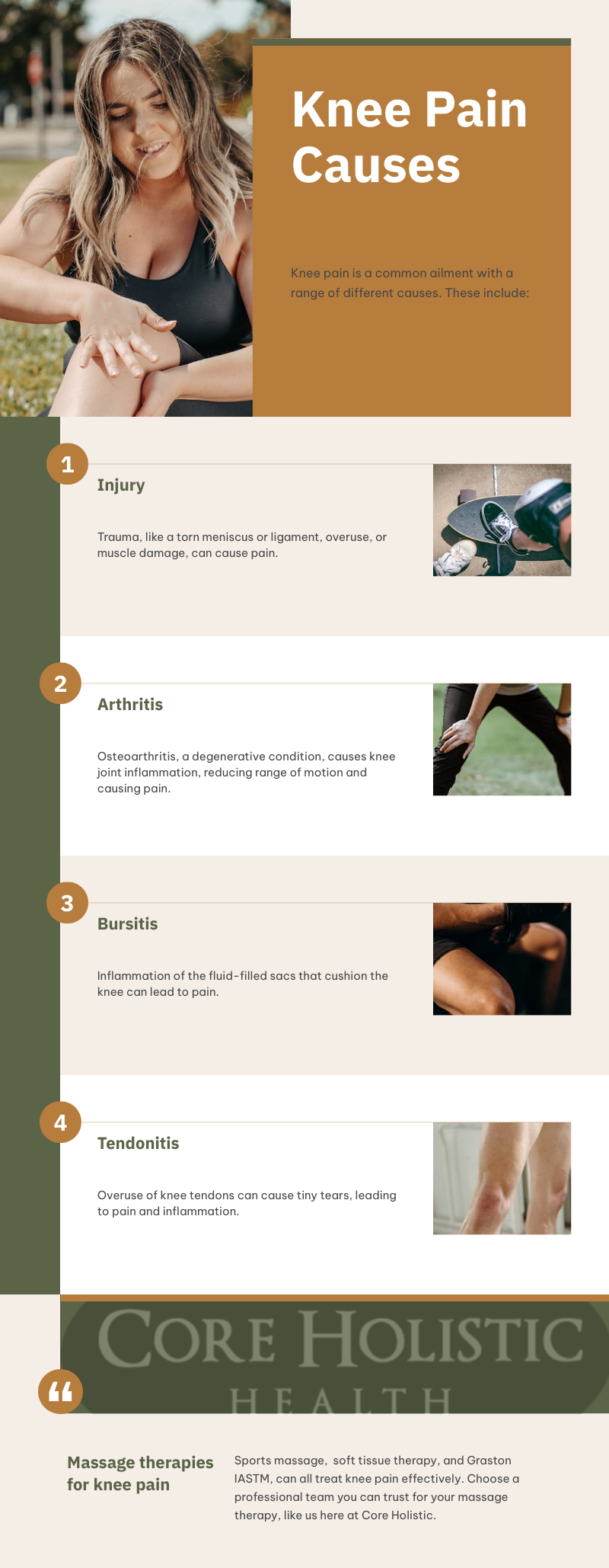 While sports massage is a type of massage therapy that was developed for athletes, this is an option that can benefit anyone experiencing knee pain. With a focus on tendons, ligaments and muscles, this therapy can help to address common knee pain issues like ligament strains and patellar tendinitis. Sports massage is a type of massage therapy that uses a combination of different techniques, including: